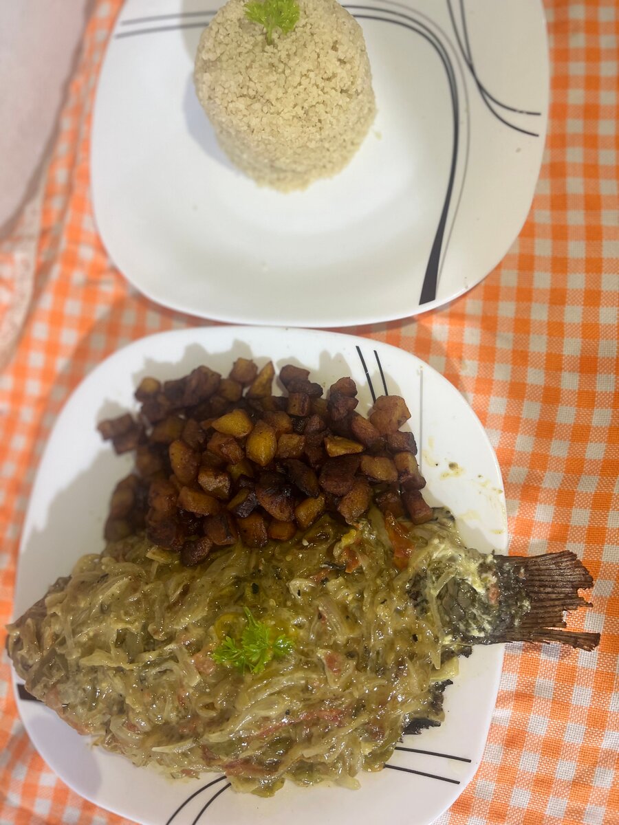 Le plat de poisson mayo es accompagné de attiéké +alloco