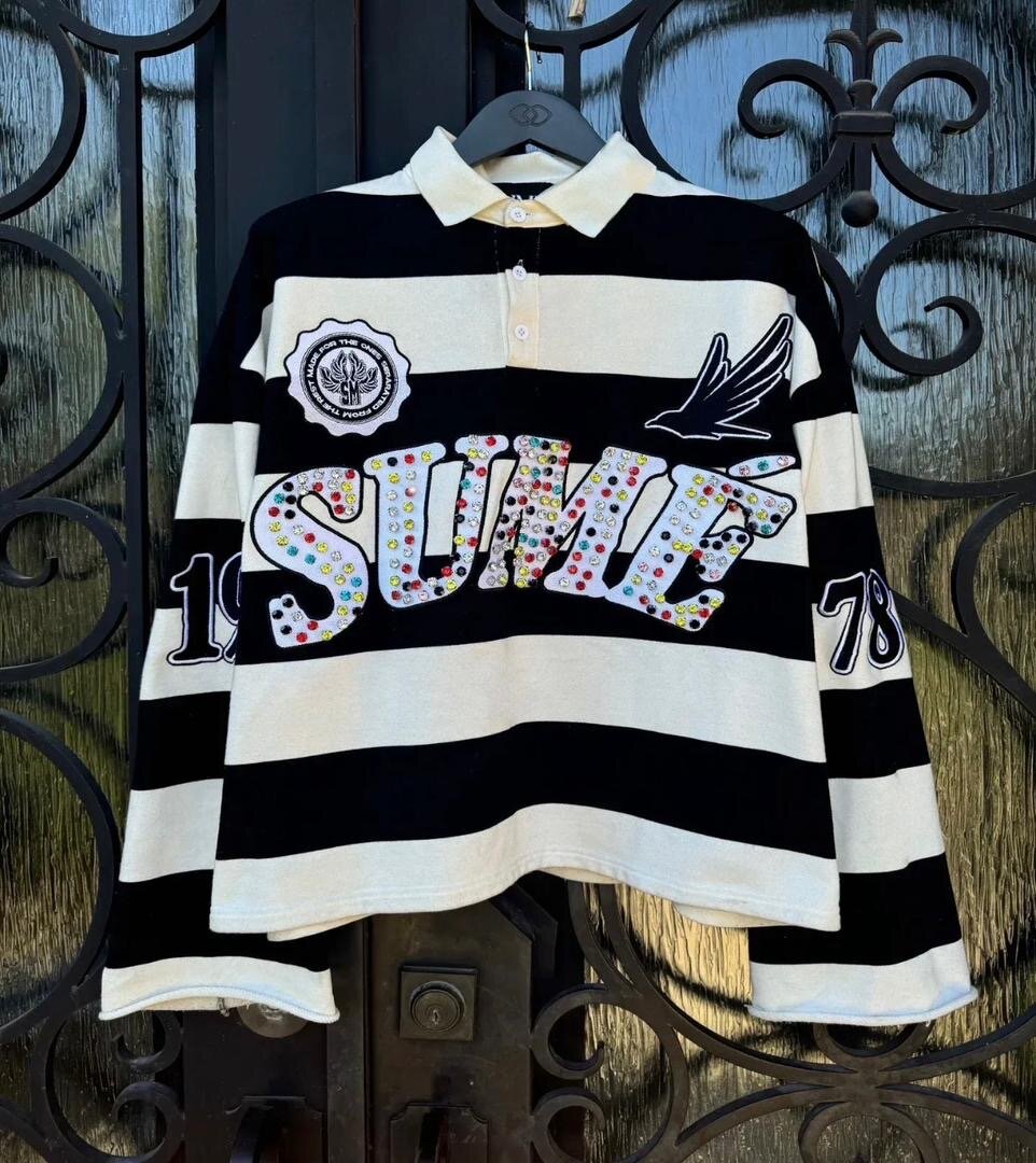 Optez pour ce polo tendance à rayures noires et blanches, idéal pour un look urbain et décontracté. Conçu en coton doux, il arbore des motifs et un lettrage qui ajoutent une touche unique et stylée. Parfait pour être porté lors de sorties en ville ou entre amis, il s'associe facilement avec un jean ou un pantalon chinos.