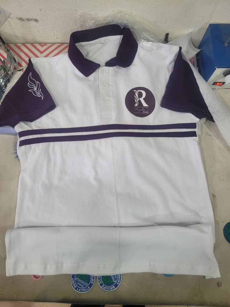Polo blanc élégant avec col et manches violets. Idéal pour un look casual chic. Parfait pour les sorties, bureaux ou événements décontractés. Offre confort et style.