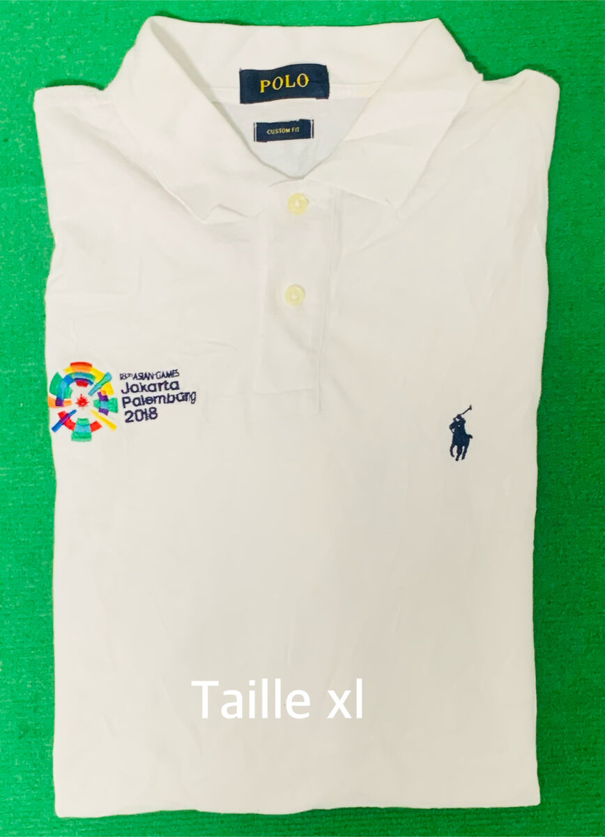 Polo blanc en coton, taille XL, idéal pour les événements sportifs ou un look décontracté au quotidien. Broderie exclusive Jakarta Palembang 2018.