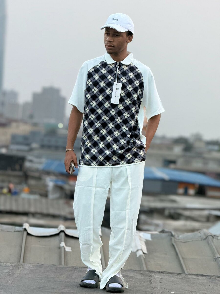 Polo élégant pour homme avec motif à carreaux noir et blanc. Conçu pour un style décontracté mais raffiné. Disponible avec des manches contrastées.