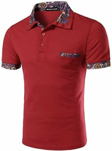 Polo homme rouge col et poignets motif wax, idéal communication, cadeau entreprise, style moderne, parfait pour événements ou équipe.