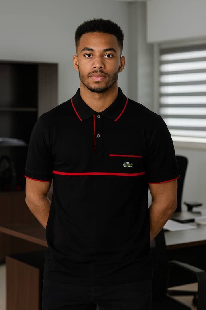 Polo élégant noir avec détails rouges, parfait pour un style casual chic. Confortable et polyvalent, idéal pour les sorties ou le bureau.