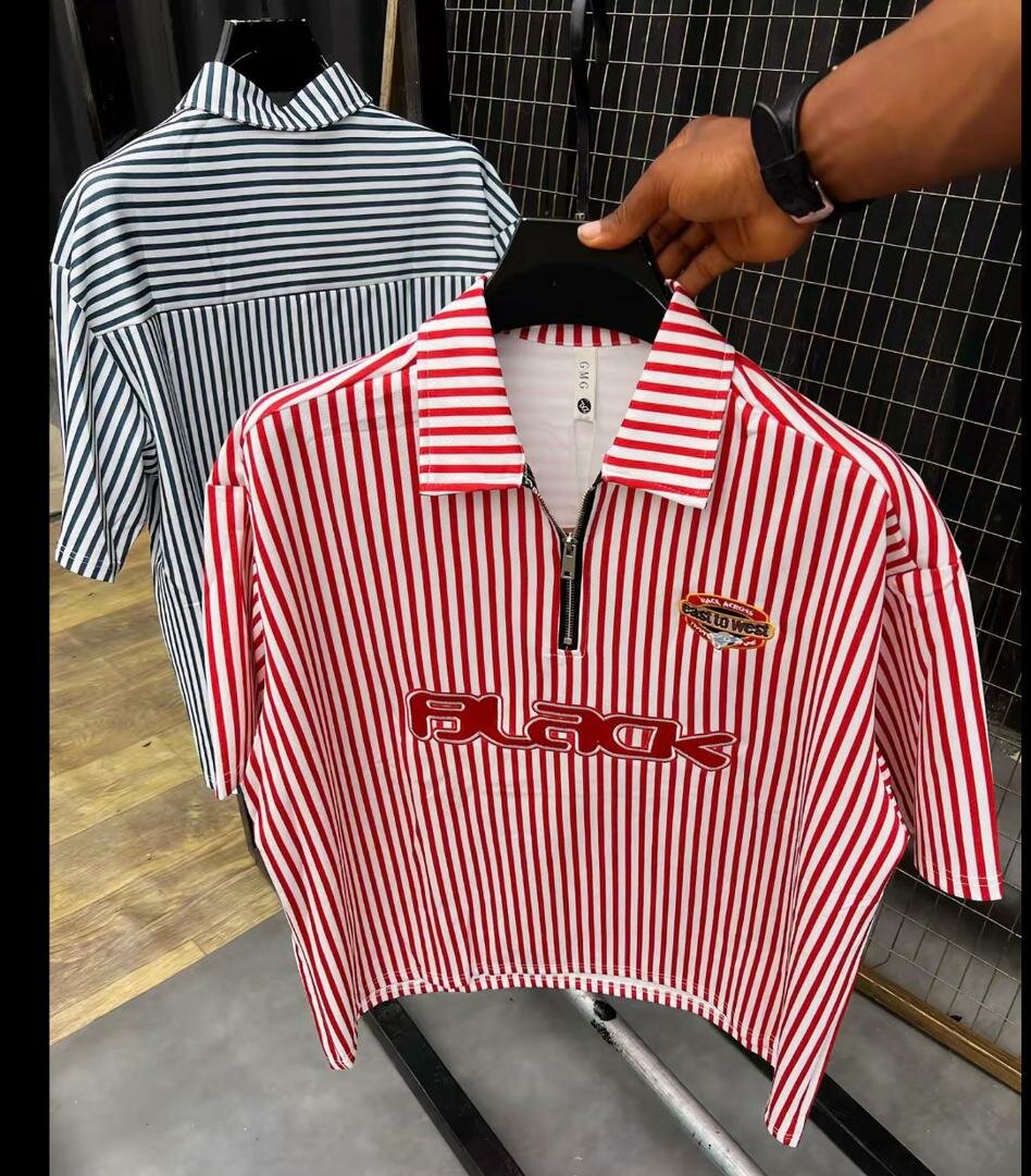 Vêtements moderne à rayures avec fermeture éclair et motif 'Black'. Idéal pour un style décontracté et tendance. Disponible en rouge et bleu. Parfait pour un look estival ou une sortie entre amis.
