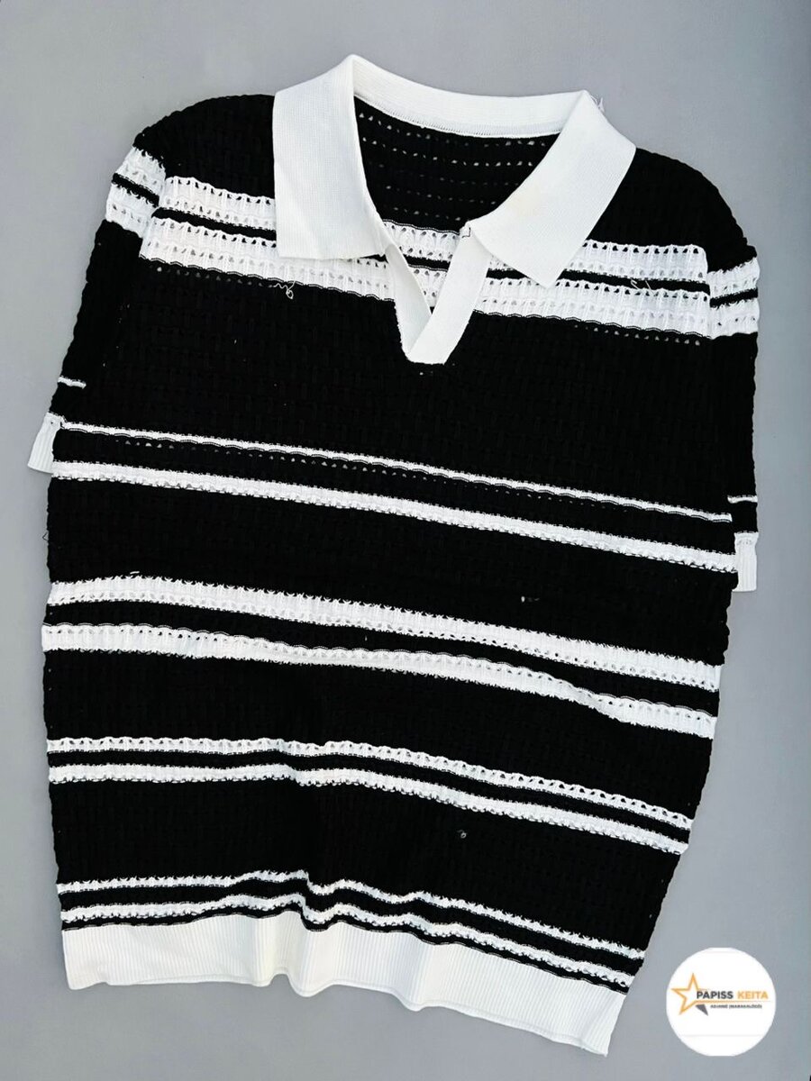 Ce polo rayé noir et blanc est un choix idéal pour un look élégant et décontracté. Fabriqué avec des matériaux de qualité, il offre confort et style. Parfait pour une tenue quotidienne ou une sortie entre amis. Associez-le avec un jean pour un look moderne et tendance.