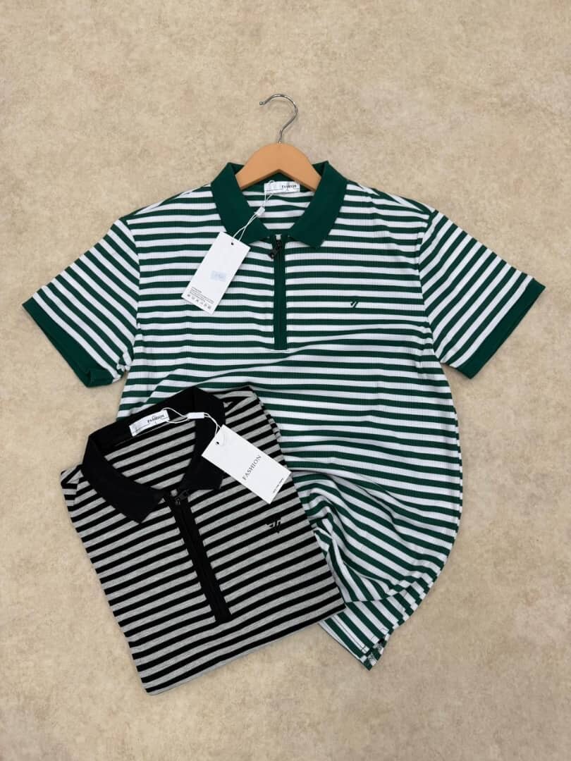 Polo élégant à manches courtes avec col et rayures vertes et blanches. Conçu pour un confort optimal, il est idéal pour les occasions décontractées ou semi-formelles. Disponible en plusieurs tailles.