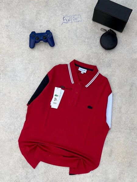 Polo homme en coton rouge avec manches contrastées noires. Idéal pour un look casual chic, ce vêtement assure style et confort au quotidien. Parfait pour les sorties décontractées ou une journée au bureau.