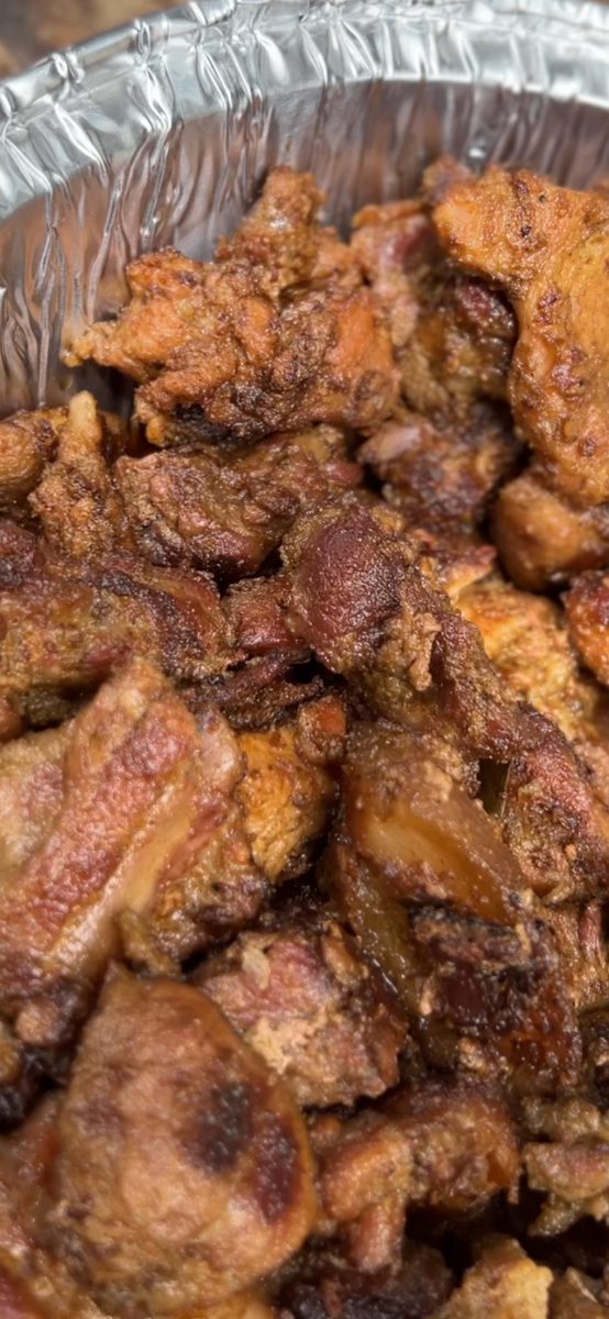 Découvrez notre spécialité : du porc lentement rôti au four, bien mariné, tendre à cœur et croustillant à lextérieur. Servi avec de lattiéké frais pour un repas généreux et irrésistible.