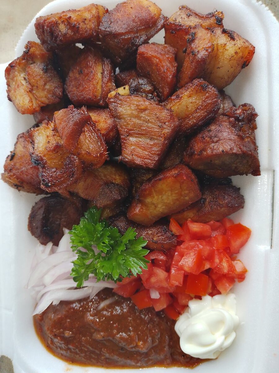 Découvrez un délice de porc frit croustillant, savamment assaisonné et servi avec des légumes frais et une sauce épicée. Parfait pour un repas convivial ou un apéritif gourmand. Laissez-vous tenter par cette explosion de saveurs!