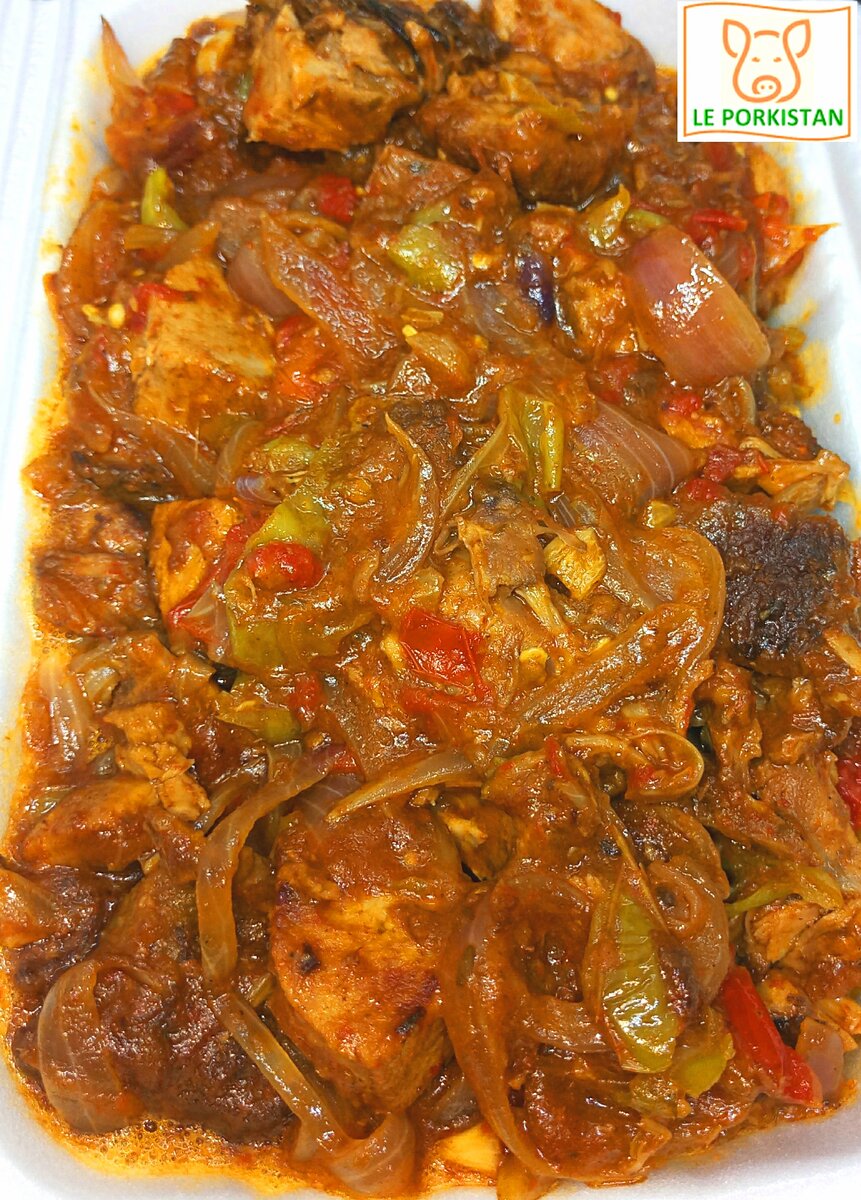 Savourez un délicieux Porc sauté aux épices et légumes locaux, richement épicé préparé avec soin par Le Porkistan. Accompagnement : attieke
