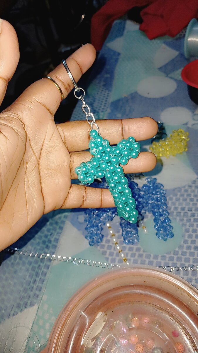 Un porte-clés élégant en forme de croix fabriqué avec des perles turquoise. Idéal pour ajouter une touche spirituelle et artistique à vos clés ou sacs. Parfait pour un cadeau personnel ou pour quelqu'un de spécial. Sa construction légère et robuste assure durabilité et style.