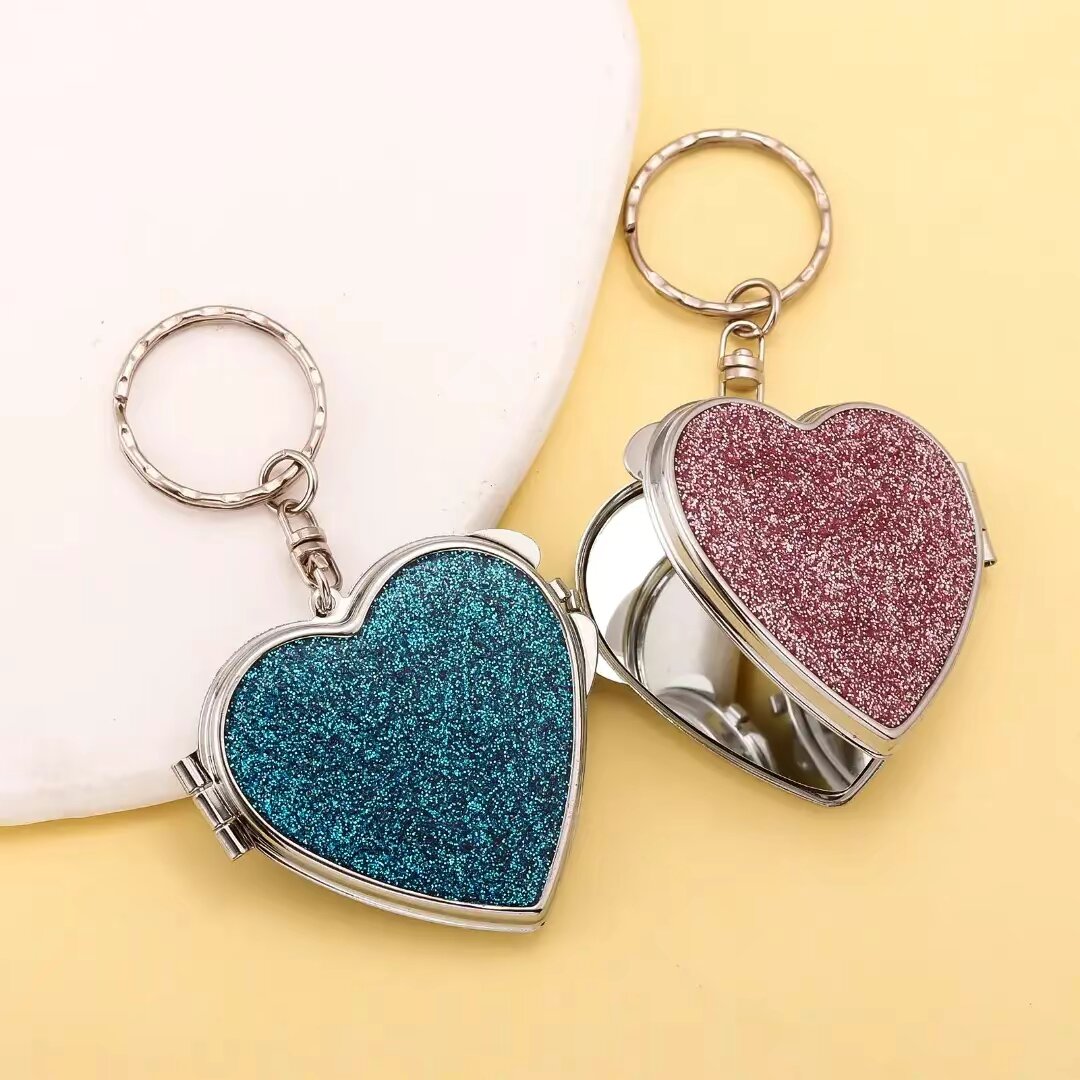 Porte-clés en forme de cœur avec miroir et paillettes. Un accessoire élégant et pratique, parfait pour les femmes et les jeunes filles. Léger et facile à utiliser, il est idéal pour compléter un sac à main ou un trousseau de clés.