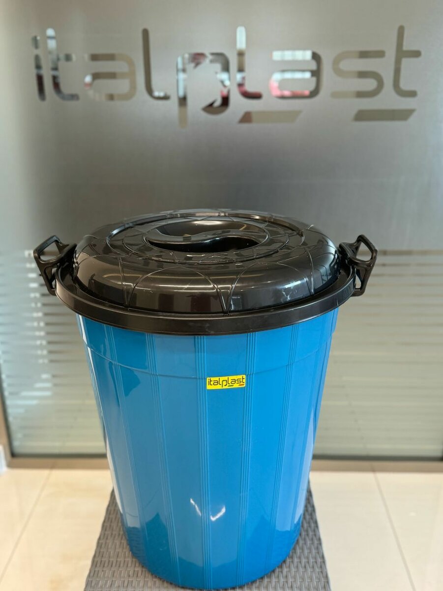 Poubelle robuste de 200L par Italplast, design bleu avec couvercle noir. Idéale pour la maison ou le bureau, elle offre une solution pratique pour le tri des déchets. Facile à nettoyer, durable et transportable grâce à ses poignées.