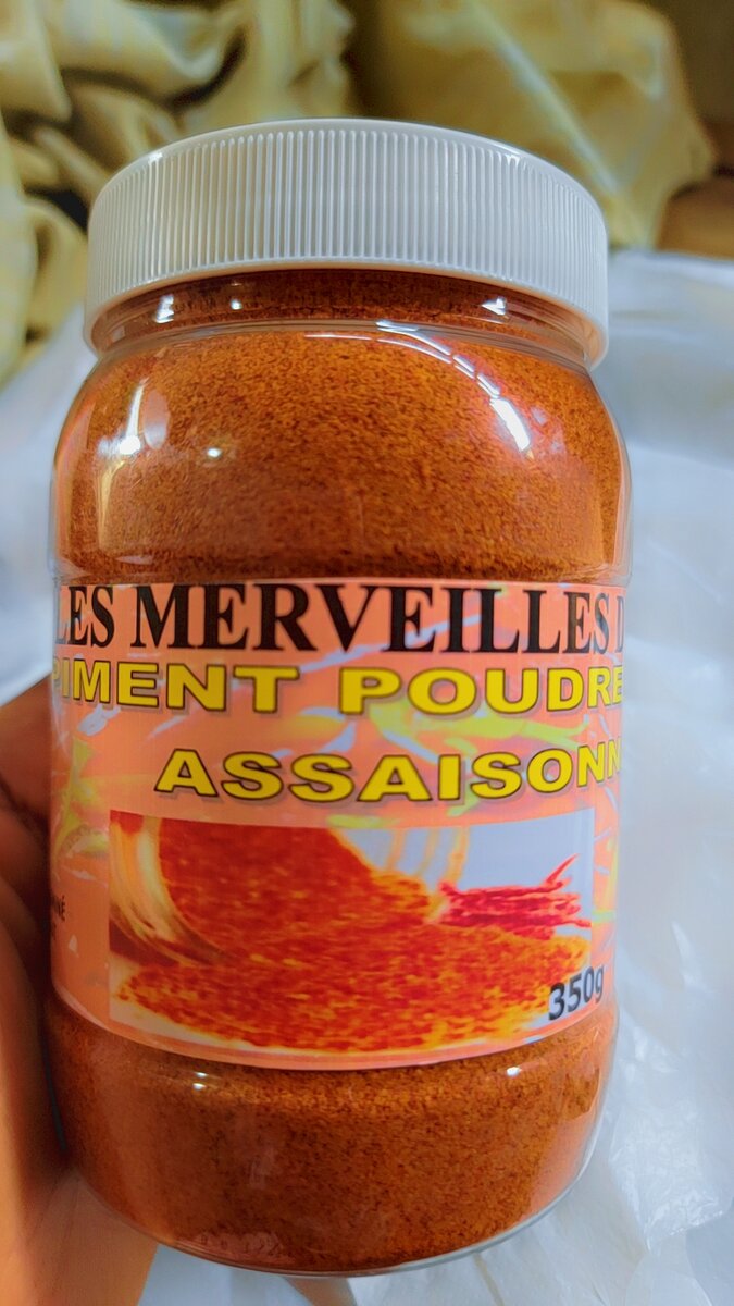 Découvrez notre poudre de piment assaisonné, parfaite pour rehausser vos plats d'une touche épicée. Ce condiment de 350g est idéal pour les amateurs de saveurs piquantes et authentiques. Parfait pour la cuisine quotidienne et professionnelle.