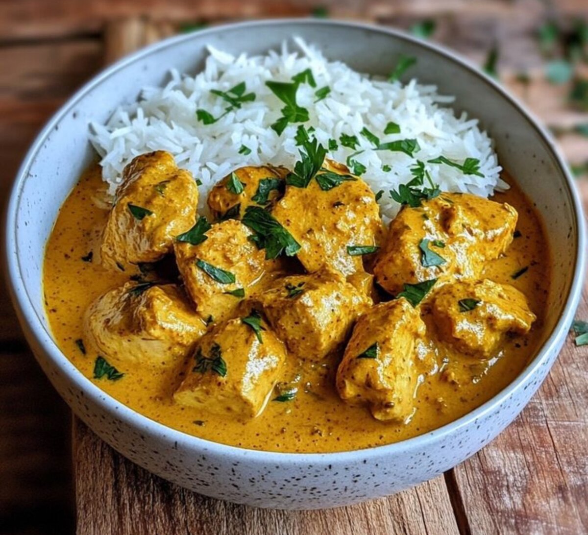 Savourez ce poulet au curry onctueux servi avec du riz parfumé. Idéal pour un dîner rapide et exotique, ce plat offre une explosion de saveurs grâce à ses épices authentiques. Préparé avec soin pour une expérience culinaire inoubliable, parfait pour les amateurs de cuisine épicée. Ajoutez une touche d'exotisme à votre table aujourd'hui !