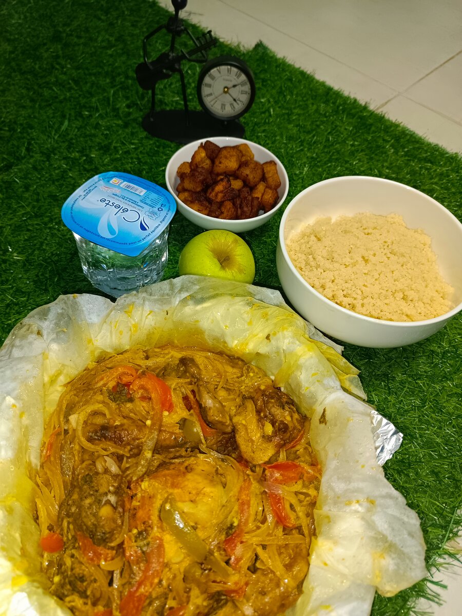 Savourez un poulet au four accompagné d'alloco et dattieké . Un festin équilibré pour une expérience culinaire authentique et gourmande.
