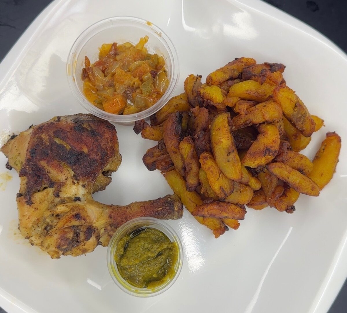Savourez ce délicieux poulet épicé accompagné de croustillantes de frites de bananes . Parfait pour un repas rapide, ce plat est sublimé par une sauce pimentée et une douce compote aux légumes.
