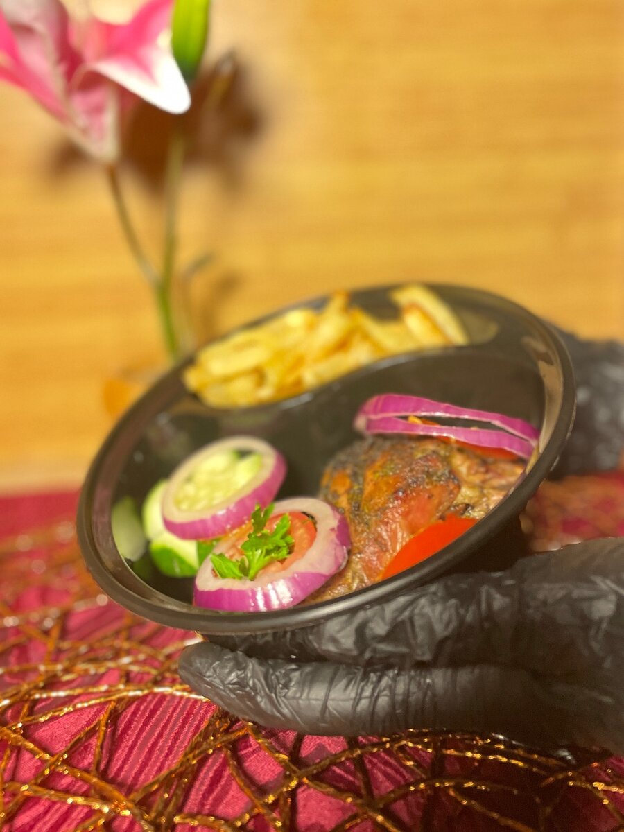 Savourez un délicieux poulet juteux accompagné de frites croustillantes et de légumes frais. Idéal pour un repas rapide et gourmand à emporter. Profitez d'une qualité restaurant chez vous !