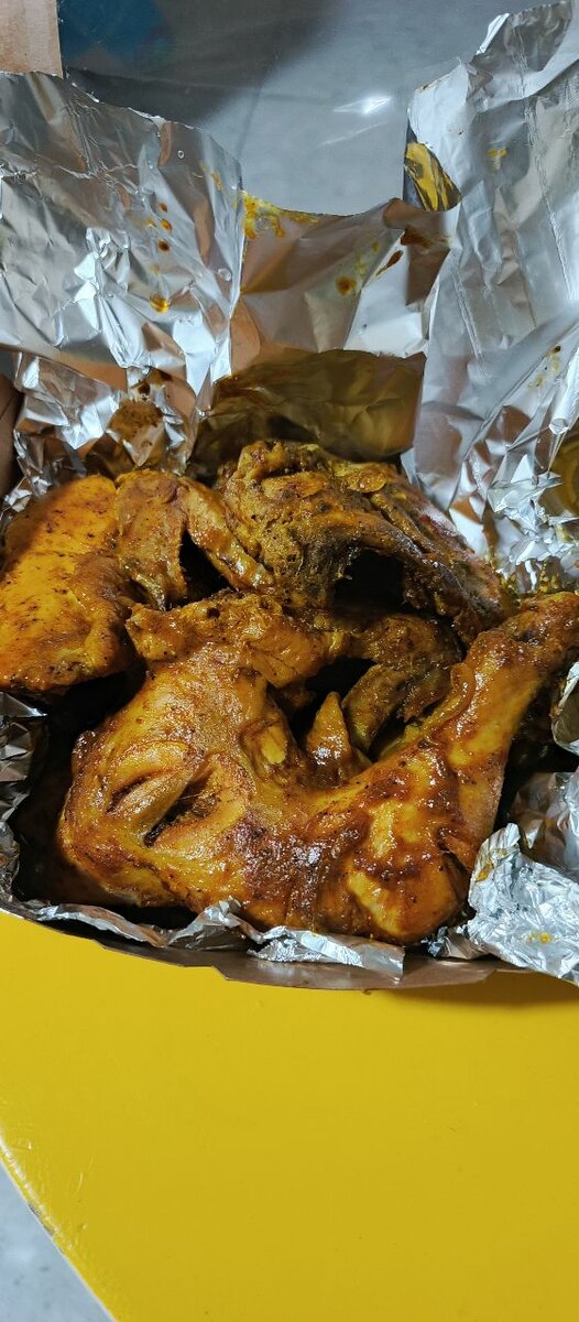 Découvrez notre poulet rôti (demi du poulet)délicatement mariné à lail frais et au curry parfumé, puis enfourné pendant 1h30 pour une cuisson lente qui révèle toute sa tendreté et ses arômes. À déguster avec nos accompagnements typiques de chez nous .