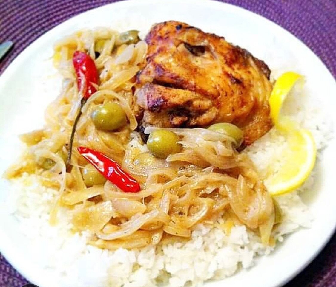 Dégustez ce délicieux poulet rôti accompagné d'olives et d'épices exotiques sur un lit de riz. Parfait pour un dîner savoureux et réconfortant. Profitez d'une explosion de saveurs qui ravira vos papilles !