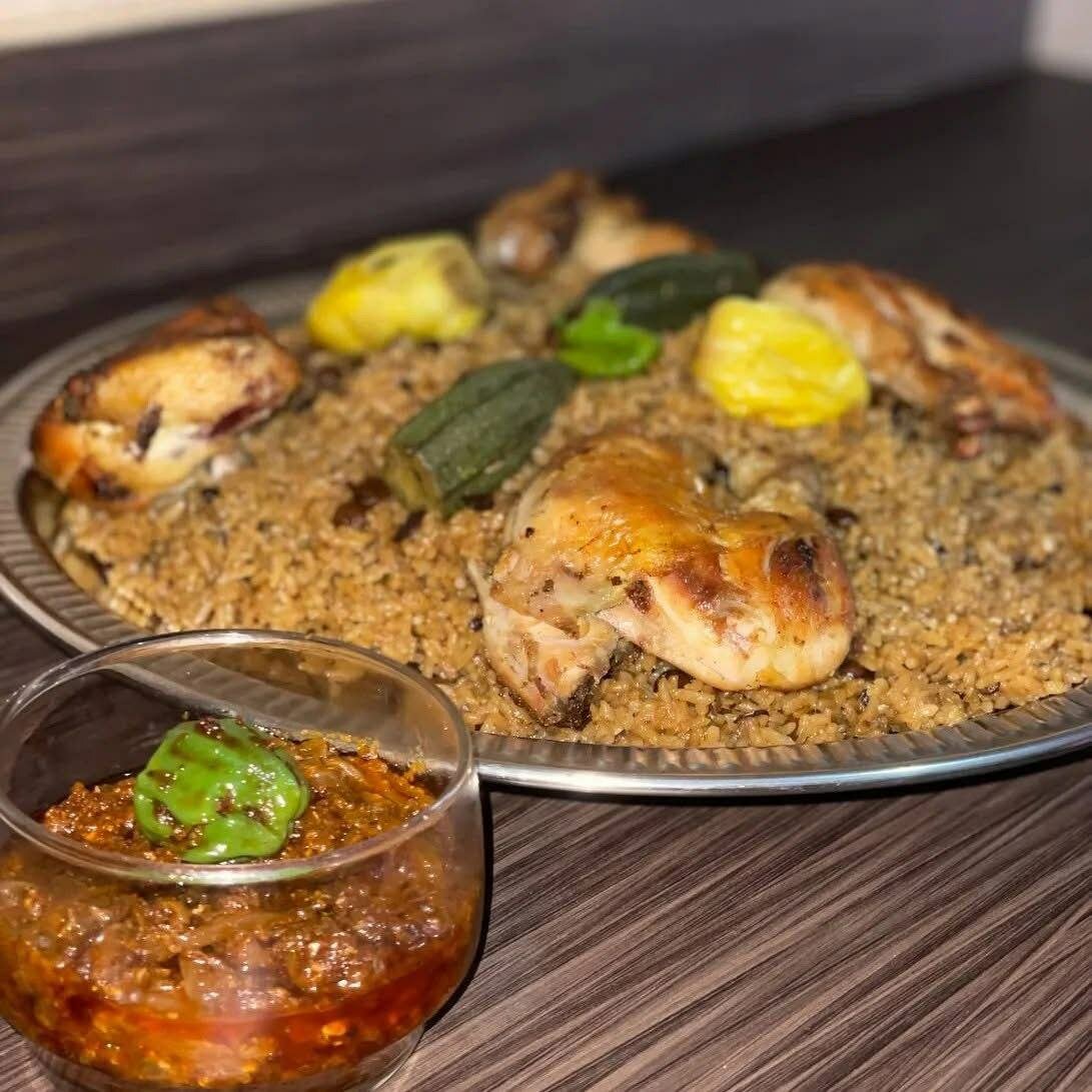 500 de riz au soumara avec 1 demi poulet bien mariné,bien asasionné avec son delicieux tombé d ' oignon .Le must c' est ce piment noir qui combiné au riz vous transporte dans une jouissance buccale..