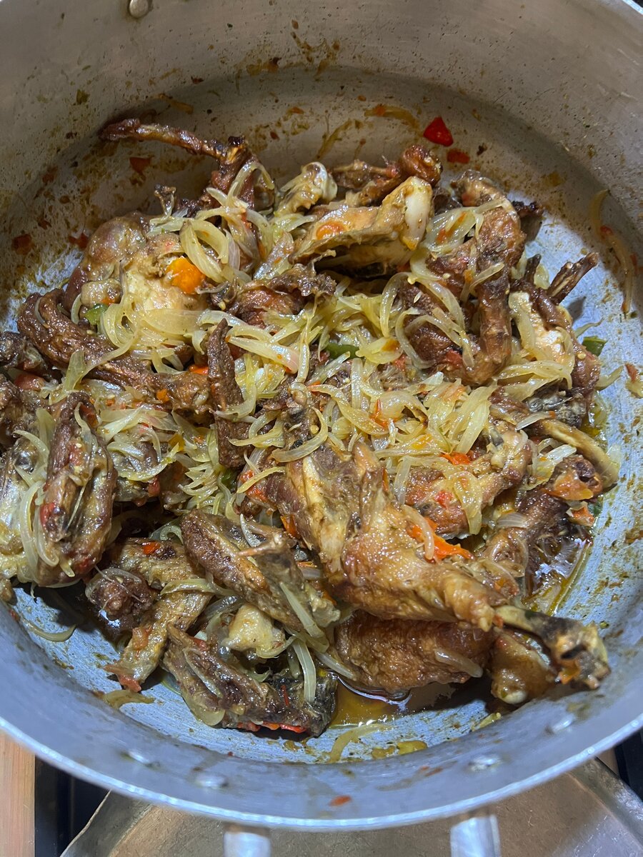 Savourez un plat exotique avec ces cuisses de grenouilles épicées, accompagnées d'oignons et d'assaisonnements. Parfait pour les amateurs de saveurs uniques, ce plat allie tendreté et épices pour une expérience culinaire distinctive. Idéal en entrée ou plat principal lors de dîners spéciaux.