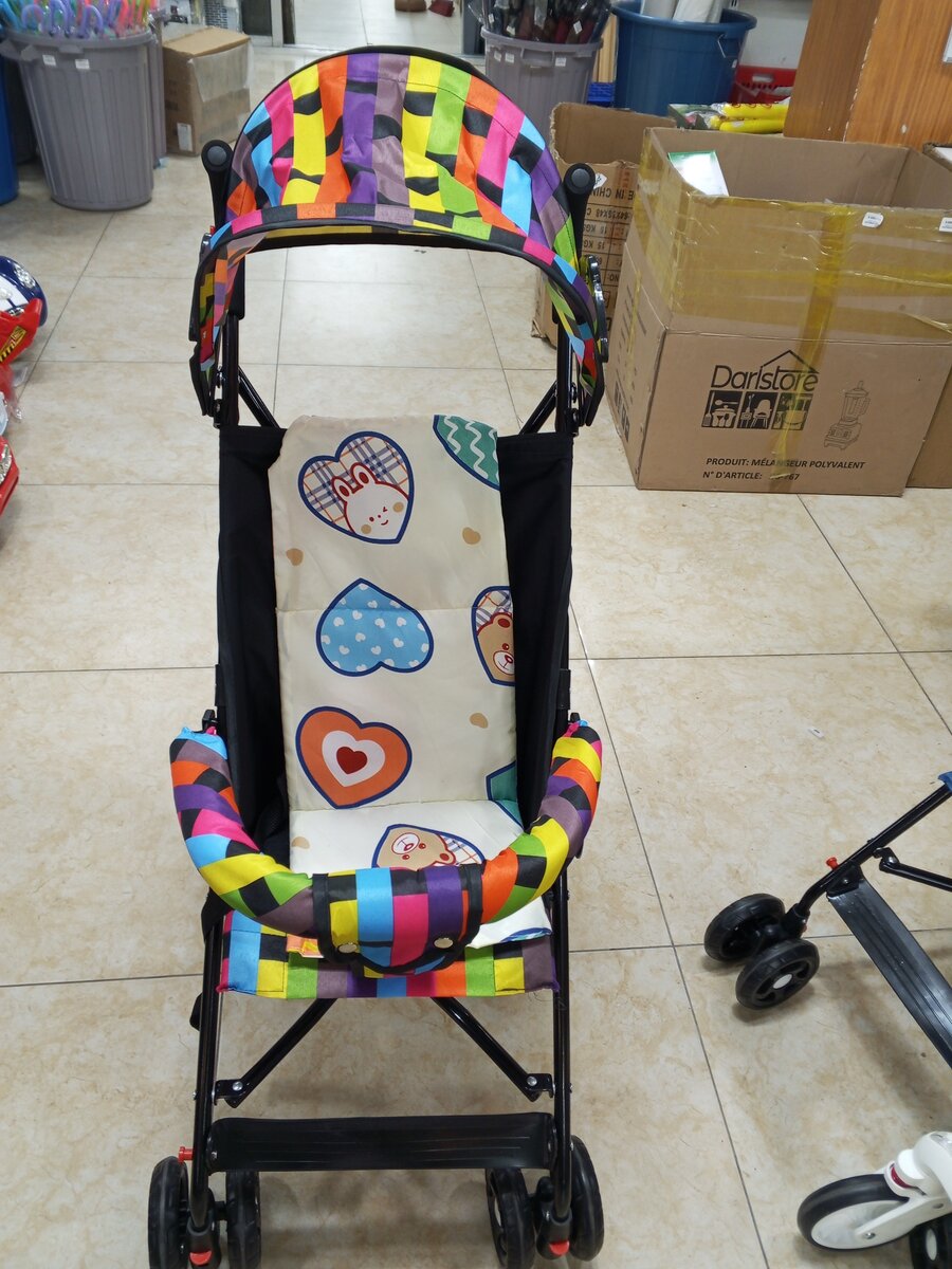 Découvrez cette poussette compacte et colorée, idéale pour vos promenades avec bébé. Légère et maniable, elle offre un confort optimal grâce à son siège moelleux et ses motifs ludiques. Parfait choix pour les parents modernes!