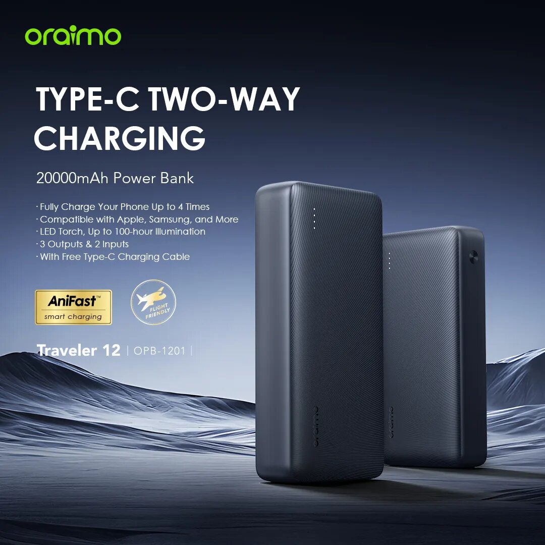 Le Power Bank 20000mAh d'Oraimo est idéal pour recharger votre téléphone jusqu'à 4 fois. Il est compatible avec Apple, Samsung et plus. Avec sa lampe LED et sa charge à double sens Type-C, il devient un compagnon parfait pour voyager.