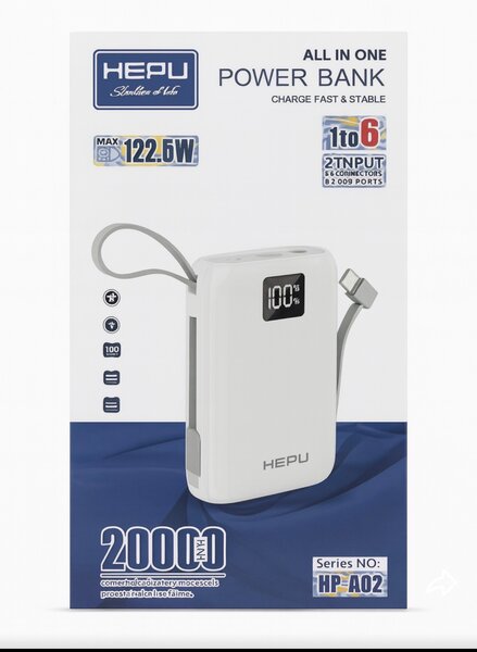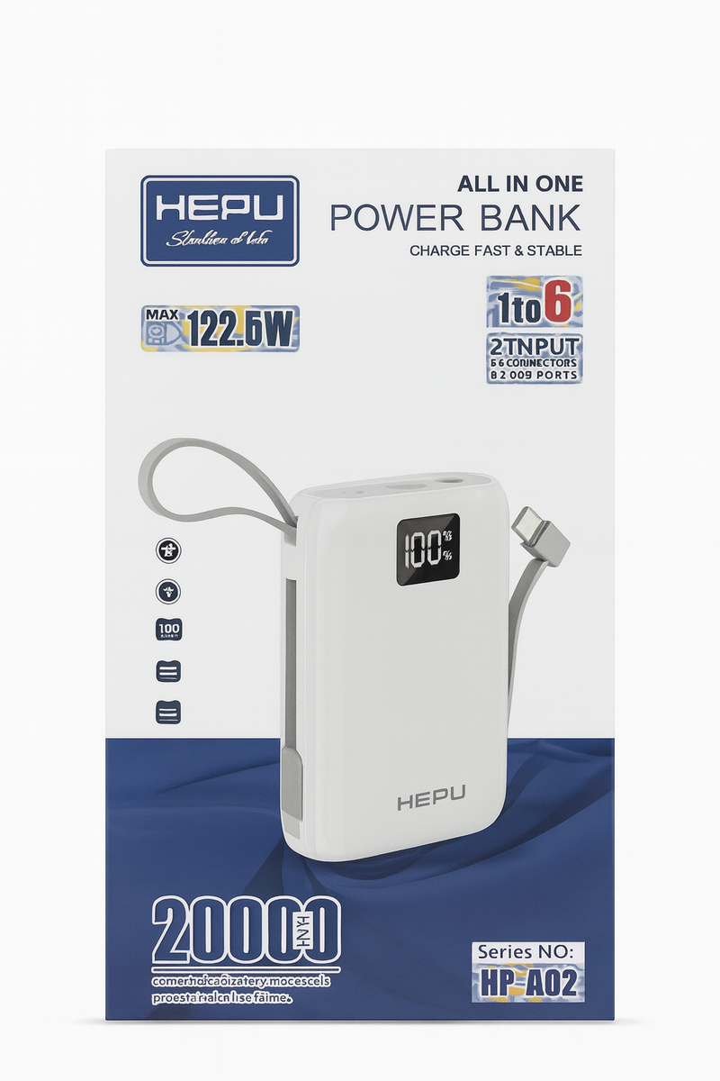Découvrez la puissance et la polyvalence du Power Bank Hepu 20000mAh. Avec sa haute capacité et ses multiples ports, il est idéal pour charger vos appareils rapidement et efficacement. Parfait pour les voyages et les déplacements quotidiens