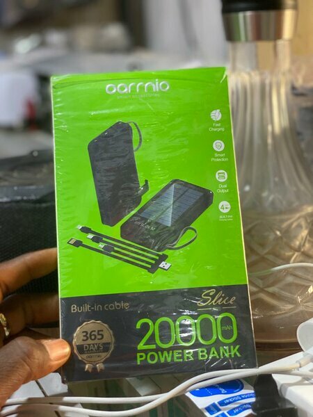 Grande power bank Oarmio 20000mAh avec câble intégré, compacte et rapide. Fournit l'énergie pour plusieurs appareils. Produit neuf.