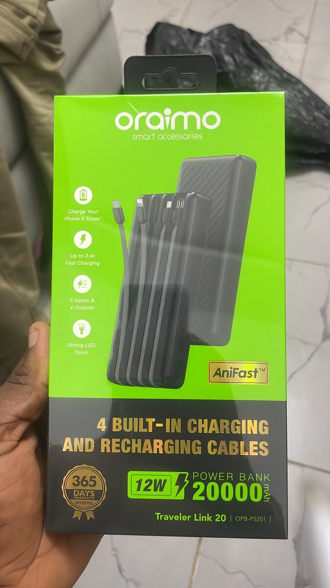 Découvrez la batterie externe Oraimo 20,000mAh avec 4 câbles intégrés pour une charge rapide 12W. Idéal pour recharger vos appareils en déplacement. Design pratique avec AniFast pour une compatibilité optimale. Garantie 365 jours.