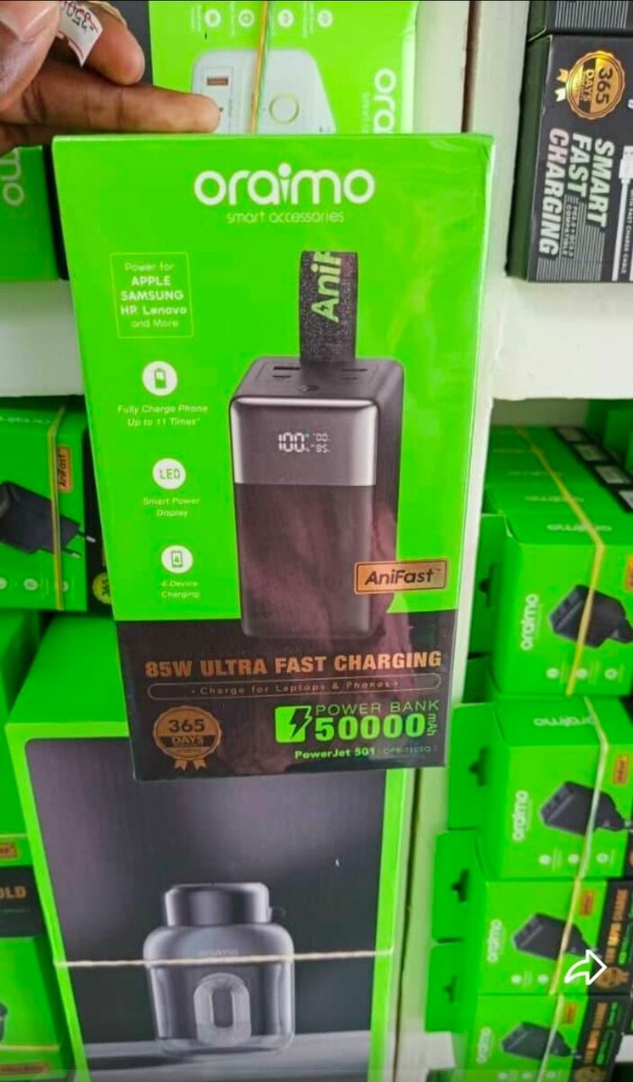 Le power bank Oraimo 85W de 50000mAh offre une recharge ultra rapide grâce à la technologie AniFast. Compatible avec Apple, Samsung et Huawei, c’est le compagnon idéal pour vos déplacements prolongés. Avec une capacité massive, il garantit plusieurs recharges d'appareils. Sa conception robuste et élégante s’adapte à toutes vos aventures.