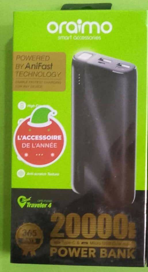 . Charge rapide(2.1A) .2 entrées Micro-UsB .1 entrée typC . peut charger 2 téléphones à la fois . série:OPB-204D . avec torche .4 points lumineux indiquant le pourcentage . capacité :20000mAh