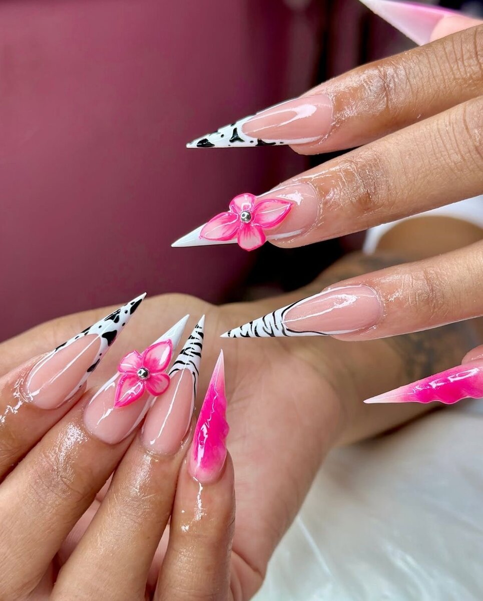Découvrez nos ongles acryliques artistiques roses, parfaits pour une touche de glamour. Ces ongles longs et élégants sont ornés de motifs floraux et noirs et blancs pour un look saisissant. Idéal pour les occasions spéciales ou pour sortir du lot au quotidien. Faciles à appliquer et durables, ils sont le choix parfait pour des ongles stylés et chic. Offrez-vous une manucure professionnelle à domicile.