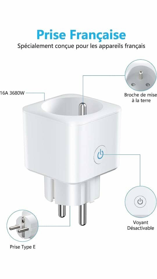 Prise connectée Wi-Fi 16A, idéale pour appareils français. Compatible Bluetooth, se connecte en 2.4 GHz. Installation facile et voyants désactivables. Simplifiez votre quotidien avec la domotique!