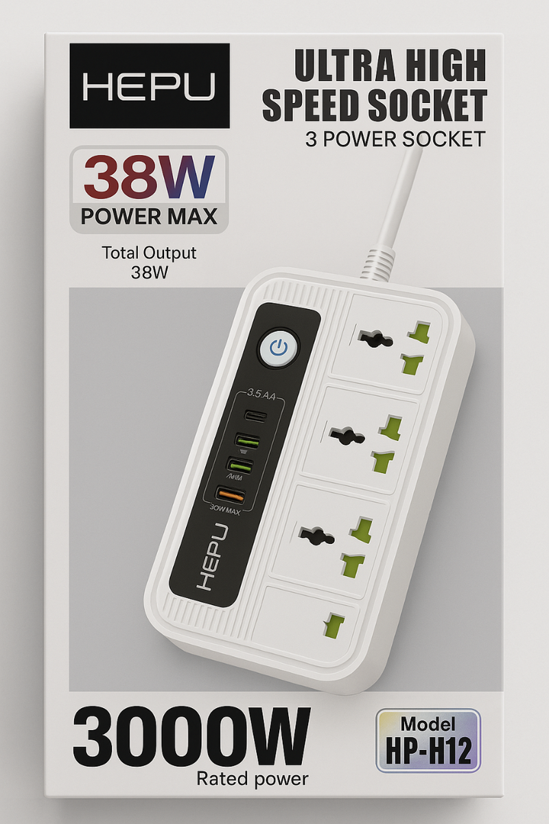 Prise HEPU ultra-rapide avec 3 sorties de puissance et sortie USB. Idéale pour alimenter plusieurs appareils à la fois, avec une puissance totale de 38W et une puissance nominale de 3000W. Parfait pour un bureau ou une maison moderne.