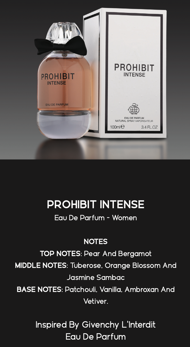Découvrez Prohibit Intense, un parfum captivant aux notes de poire, bergamote, tubéreuse, et jasmin. Sa base réconfortante de patchouli et vanille en fait un choix idéal pour la femme moderne et élégante. Parfait pour toutes les occasions.