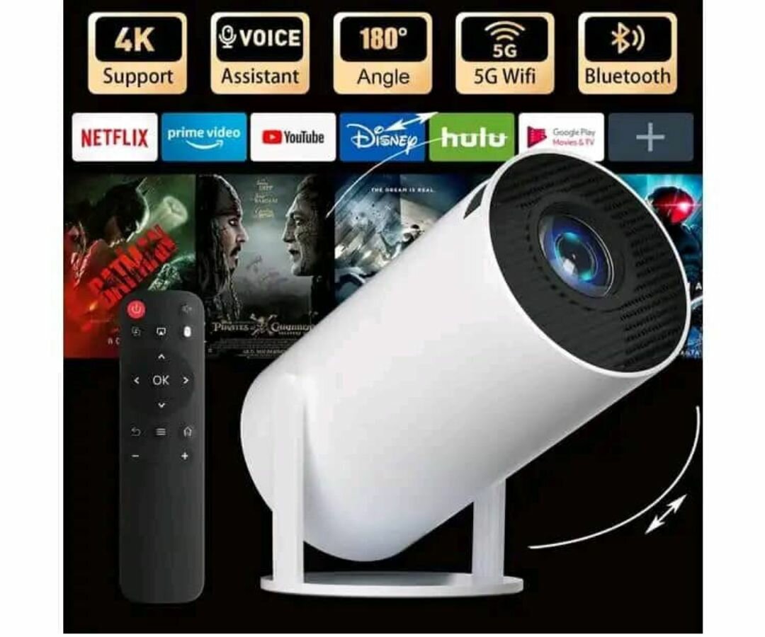 Découvrez le projecteur portable idéal pour votre divertissement. Avec sa résolution 4K, profitez d'une qualité d'image exceptionnelle. Connectivité WiFi 5G et Bluetooth intégrée pour un streaming facile depuis vos applis préférées comme Netflix et YouTube. Son angle de 180° vous offre une large couverture visuelle. Compatible avec assistants vocaux pour une utilisation simplifiée. Parfait pour le cinéma à la maison ou les présentations.