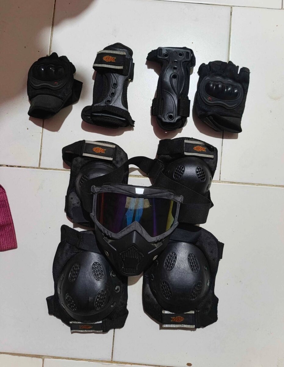 Ensemble de protection pour roller comprenant coudières, genouillères, protège-poignets et masque. Conçu pour offrir une protection maximale contre les chutes et les collisions.