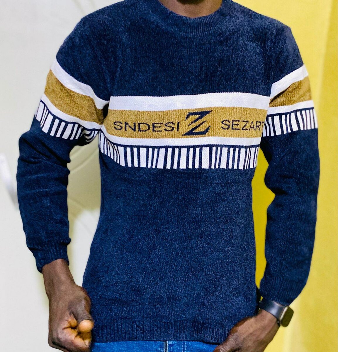Ce pull en laine bleu pour homme offre chaleur et style avec ses bandes contrastées et son logo élégant. Parfait pour l'automne et l'hiver, il se marie facilement avec un jean ou un pantalon casual. Une pièce indispensable pour votre garde-robe!
