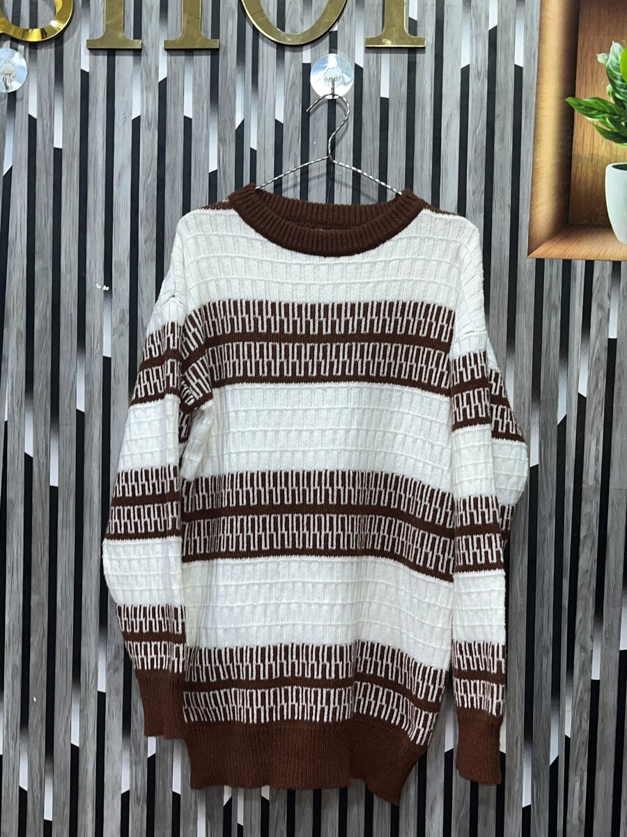 Ce pull en tricot rayé marron et blanc est parfait pour un look chic et confortable. Fabriqué avec un matériau doux, il offre chaleur et style. Idéal pour les journées fraîches, il est facile à assortir avec un jean ou un pantalon décontracté. Un incontournable pour votre garde-robe d'automne !