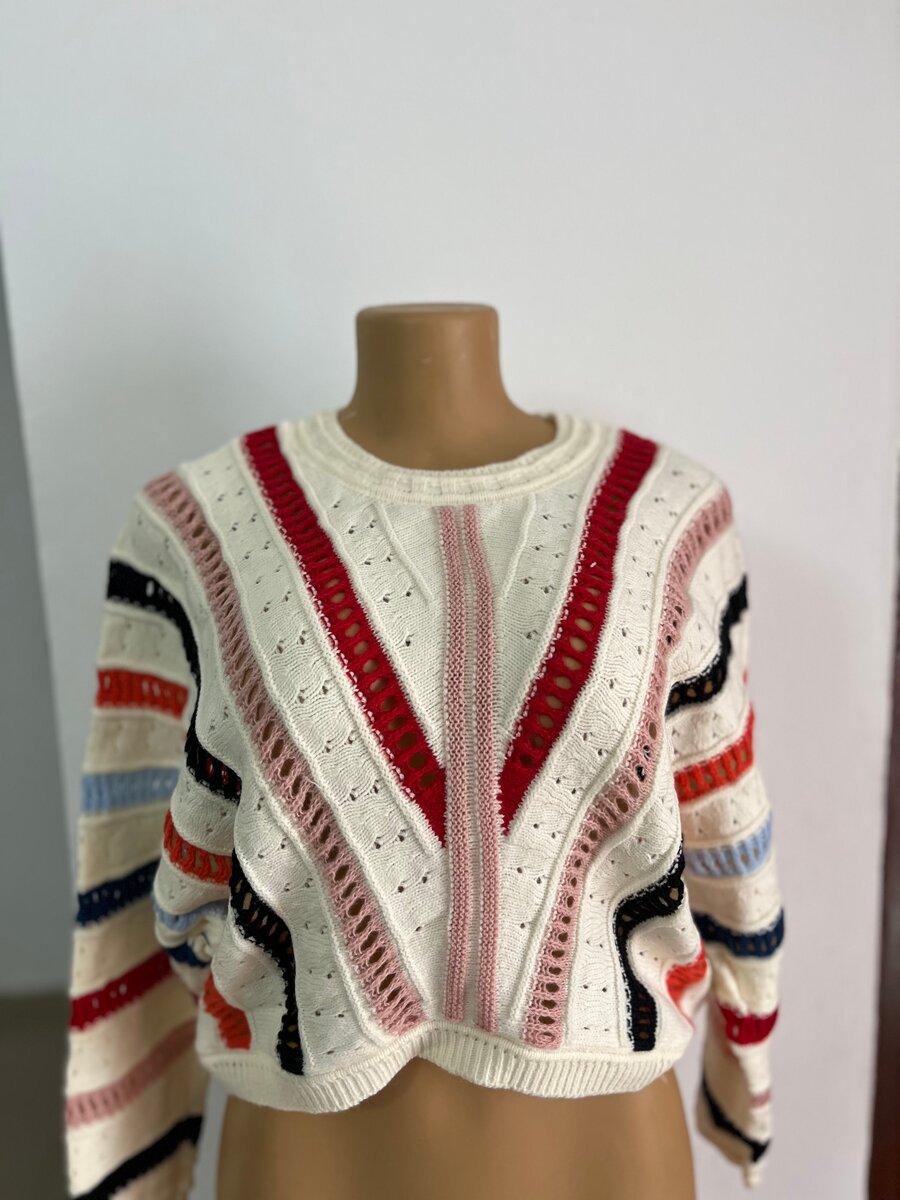 Mettez en valeur votre style avec ce pull rayé multicolore pour femme. Conçu en maille douce et confortable, il est idéal pour ajouter une touche de couleur à vos tenues. Parfait pour une journée décontractée ou une sortie entre amis, ce pull unique vous garde au chaud tout en restant tendance. Un ajout essentiel à votre garde-robe!