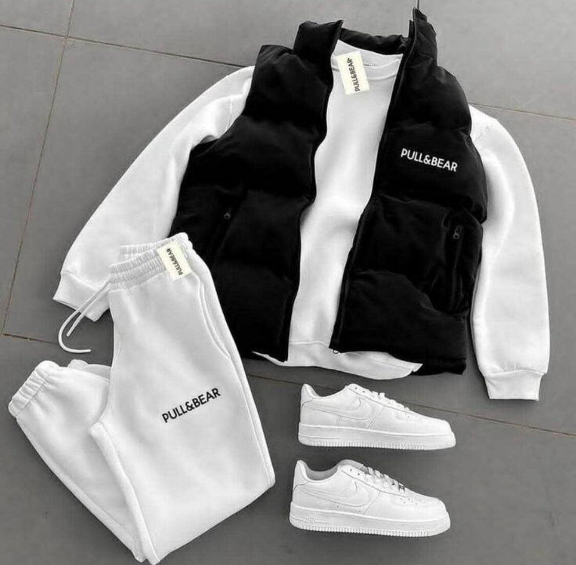 Ensemble Pull&Bear pour homme comprenant un sweat, un gilet et des baskets blanches. Confortable et élégant, idéal pour le quotidien.