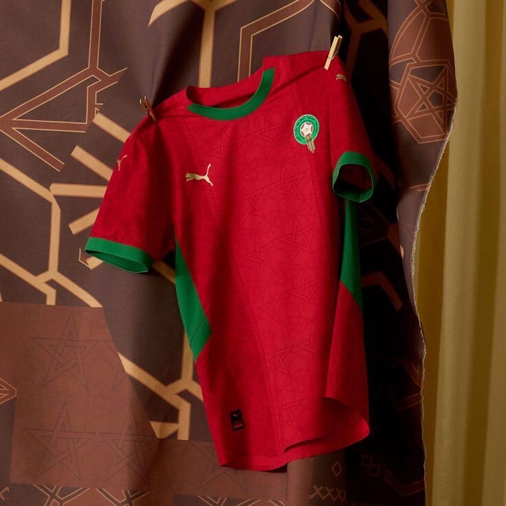 Maillot de foot Maroc Puma pour homme et femme, officiel et authentique. Domicile 2024, rouge et vert, pour les fans de football.