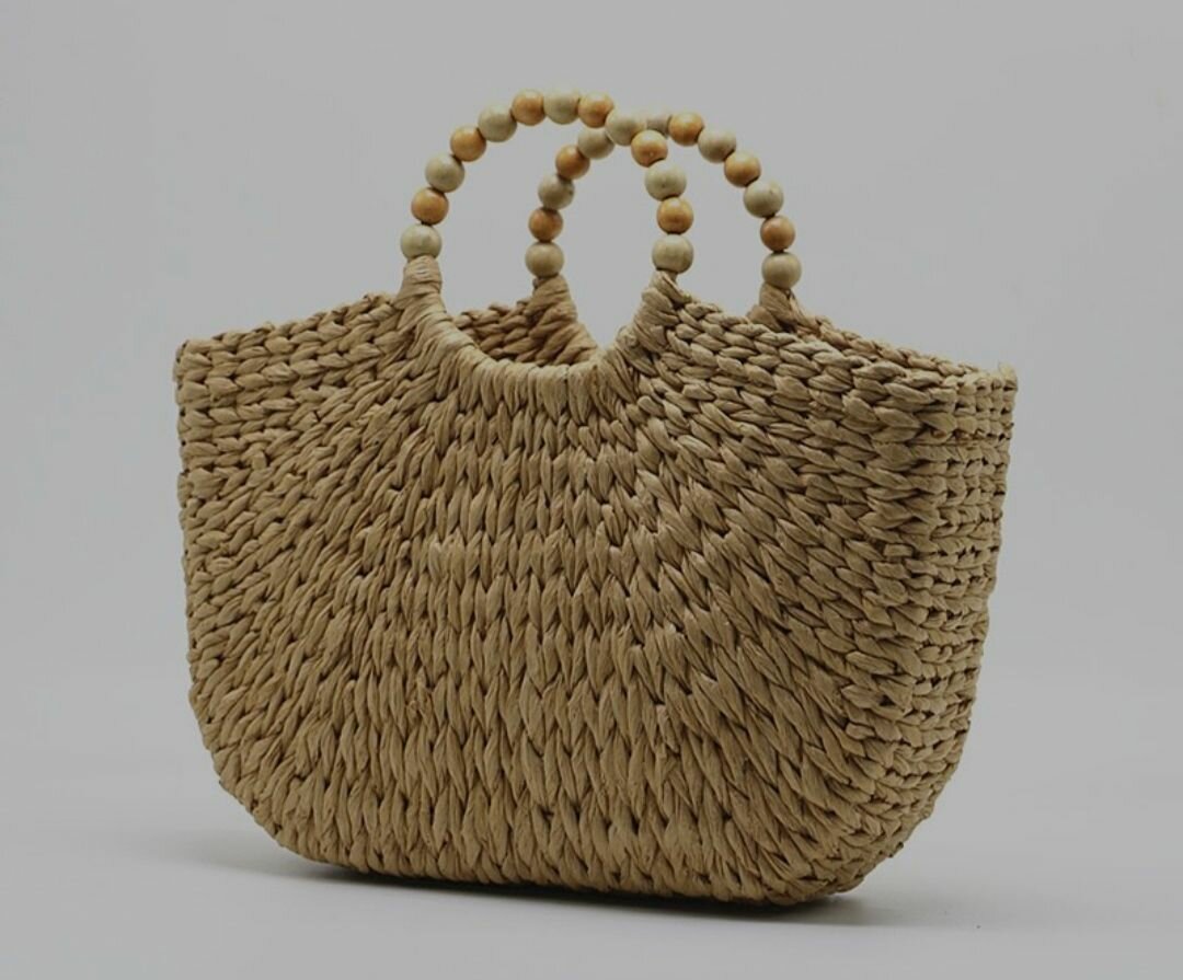 Красивая плетёная сумочка из рафии. Бусы на ручке из дерева.