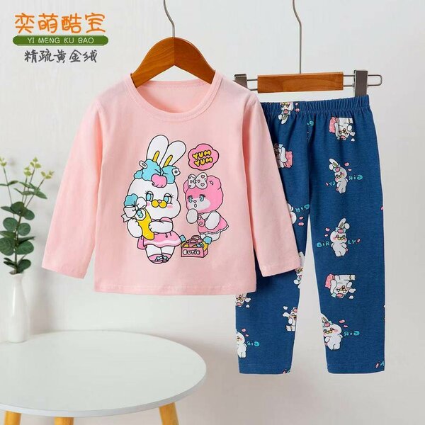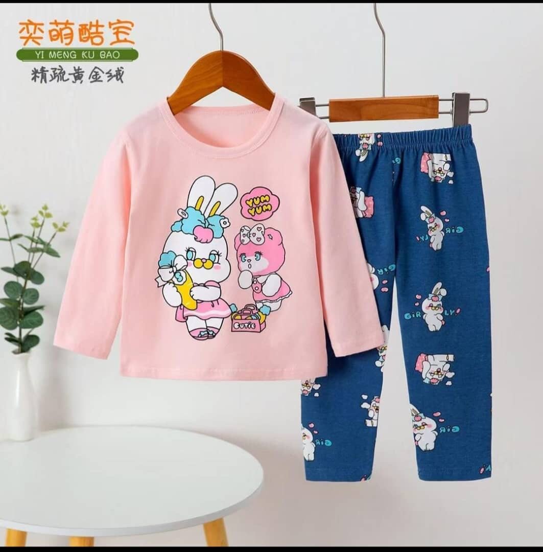 Pyjama confortable pour enfant avec imprimé mignon de lapin et ours. Fabriqué en coton doux, idéal pour un sommeil paisible. Comprend haut rose et pantalon imprimé bleu. Parfait pour les soirées cocooning.
