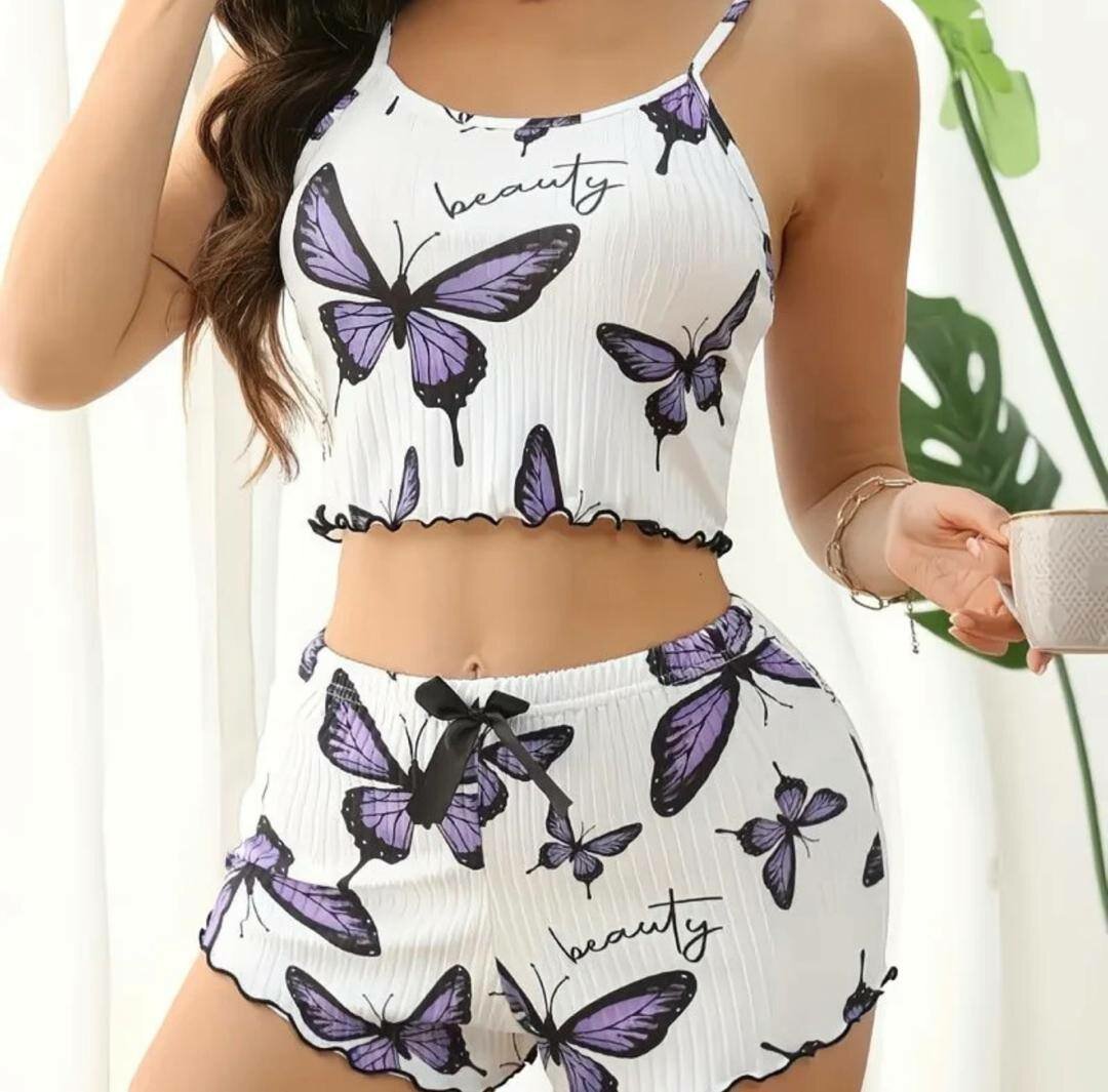 Ensemble de pyjama confortable pour femme, motif papillon violet, parfait pour un sommeil paisible ou une soirée décontractée à la maison