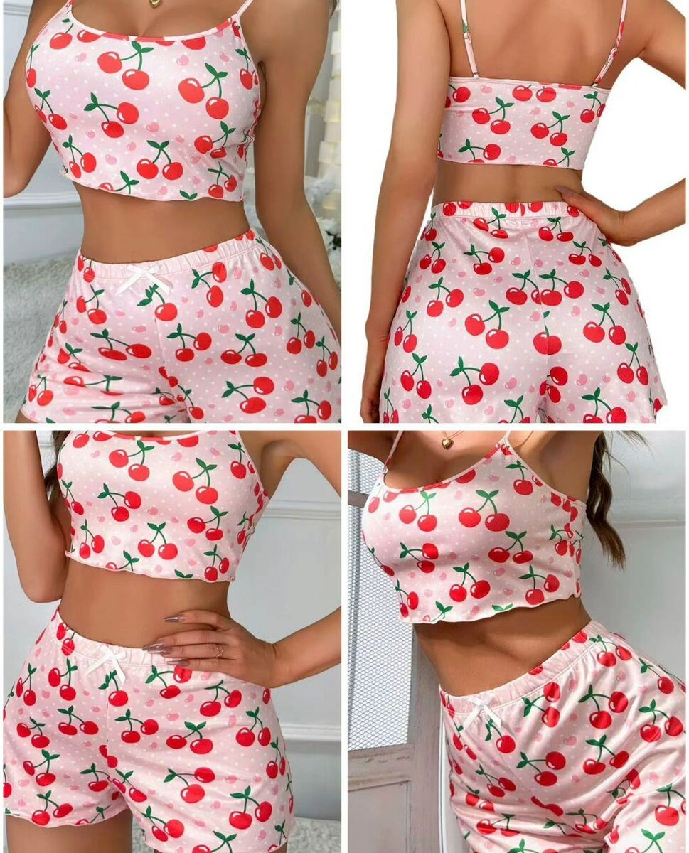 Ensemble pyjama femme avec motif cerises, parfait pour l'été. Fabriqué en tissu doux et respirant, offre un confort optimal pour la nuit ou détente à la maison. Idéal pour une allure féminine et pétillante.