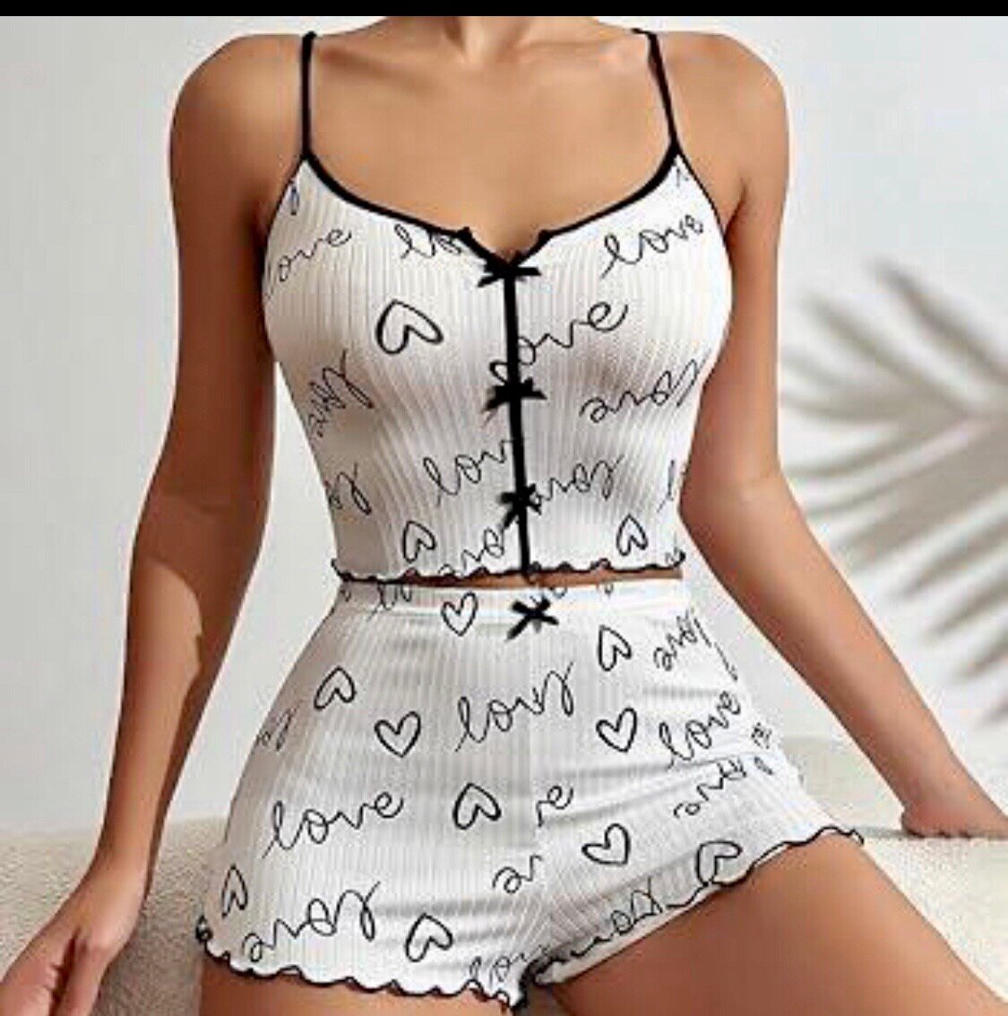 Découvrez ce pyjama féminin élégant et confortable, parfait pour des nuits douces. Conçu avec des motifs de cœurs et de mots 'love', il apporte une touche de romance à votre garde-robe de nuit. Les bretelles fines et le tissu doux assurent un confort optimal. Idéal pour se détendre et se sentir bien chez soi.