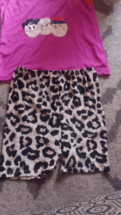 Confortable pyjama pour femme avec haut rose vif à imprimé amusant et short motif léopard. Parfait pour des nuits douillettes ou des moments de détente à la maison.